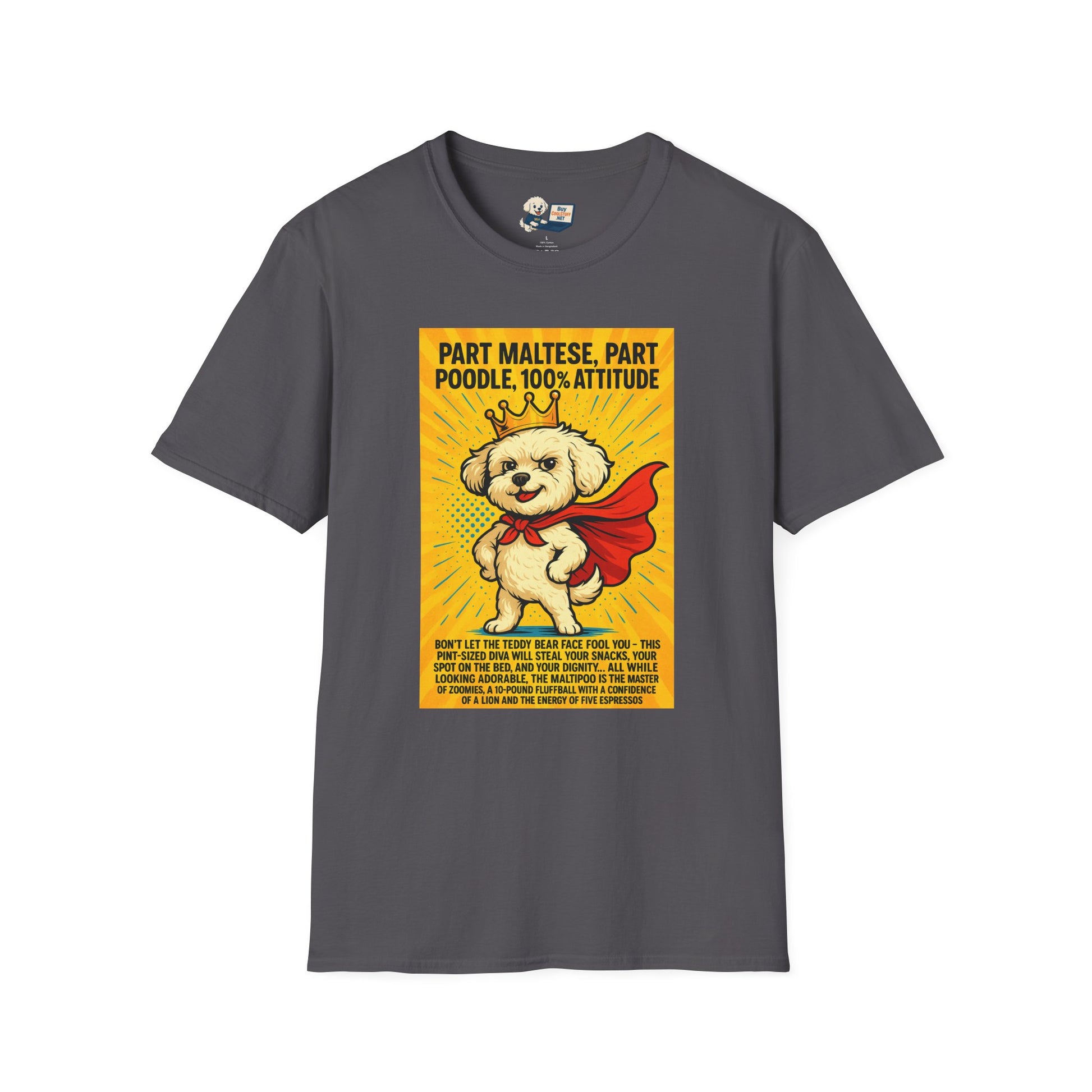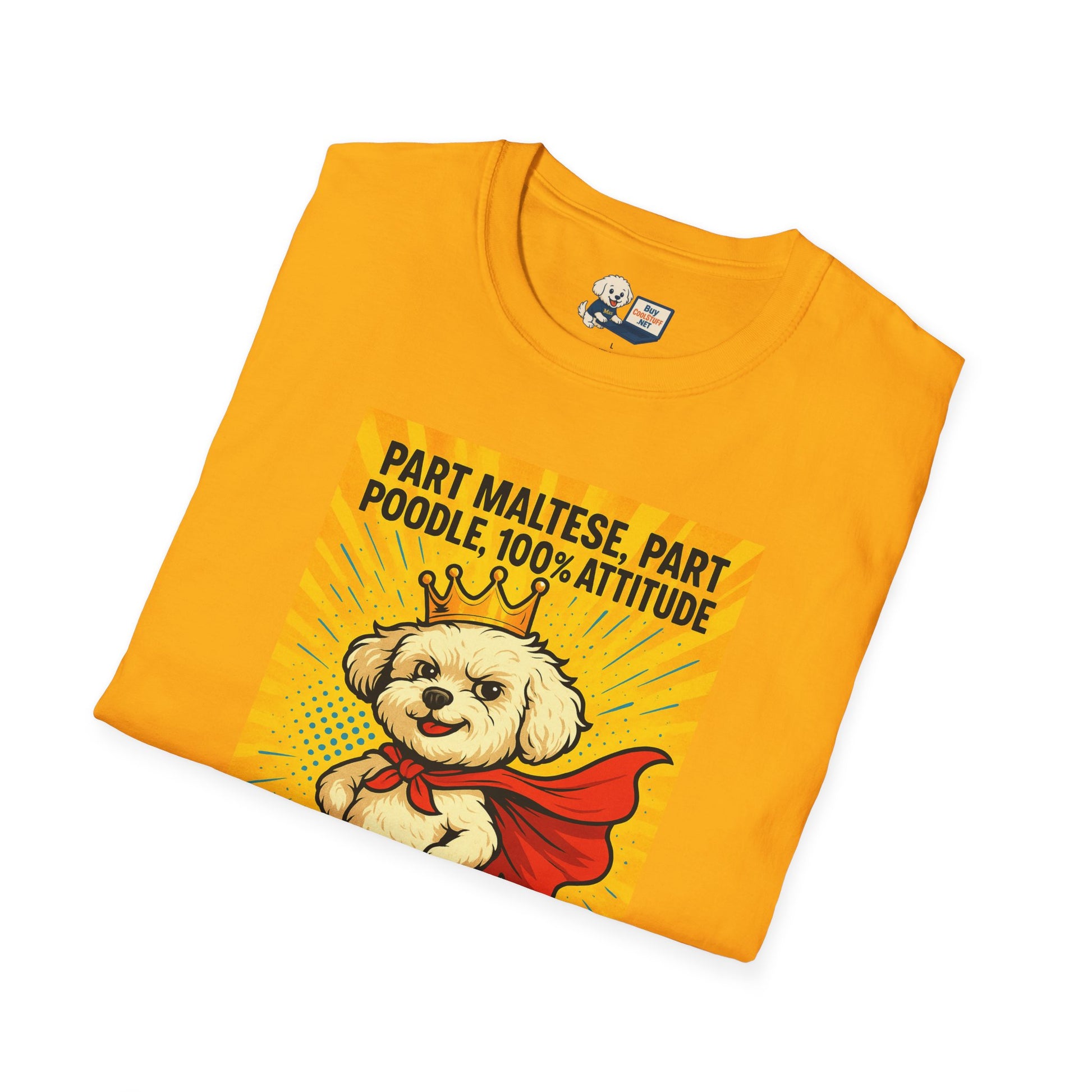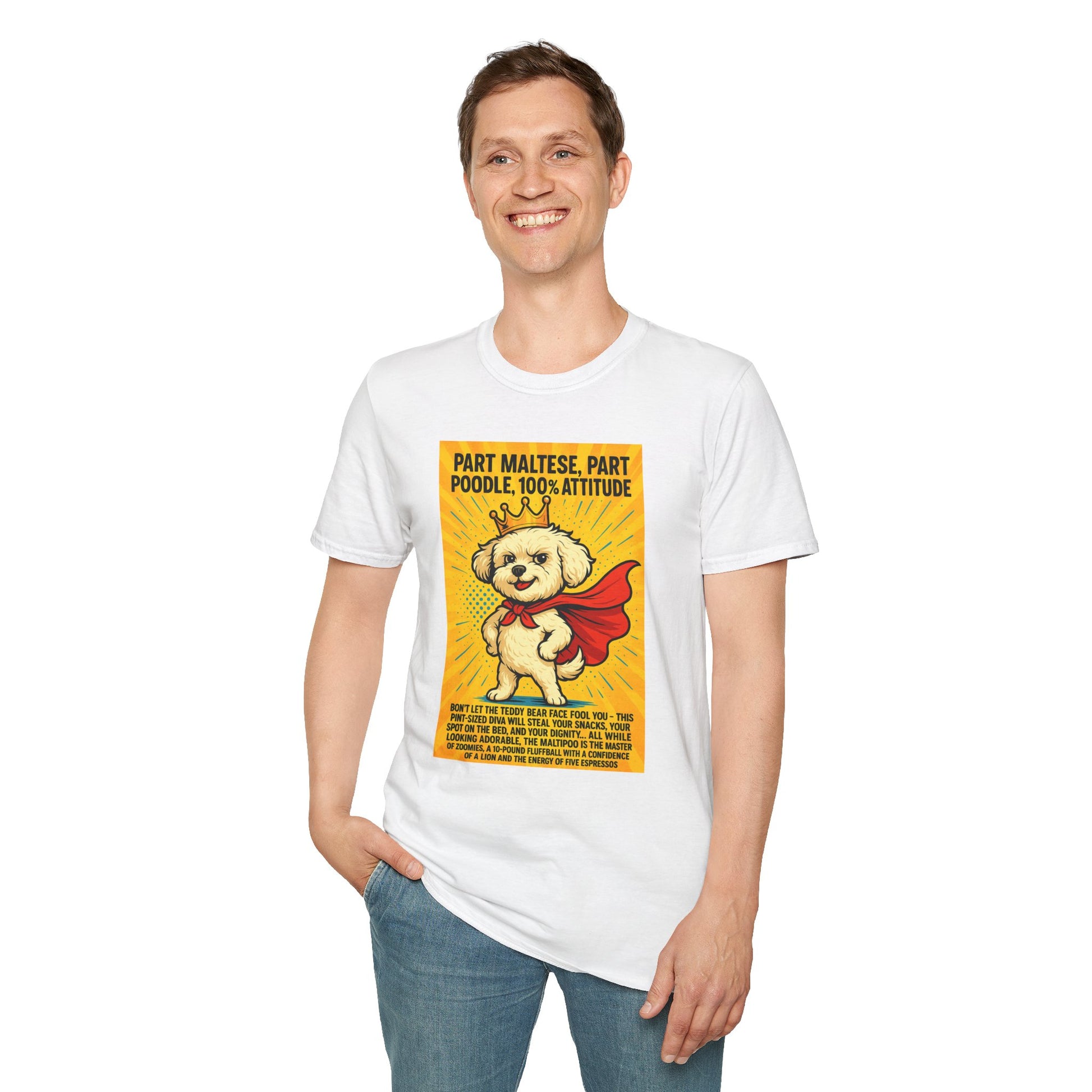 Unleash the fluff-powered hero in your life with the Maltipoo "Superhero" Unisex Softstyle T-Shirt! Featuring everyone’s favorite pint-sized sidekick with a heart (and hair) of gold, this tee is a must-have for dog lovers who know their pup is basically a caped crusader. Whether it’s saving you from loneliness, alerting you to every Amazon delivery, or defeating evil snacks, your Maltipoo is always on duty. Soft, comfy, and packed with paw-sitive energy—this is the perfect gift for anyone who believes heroes come with wagging tails!